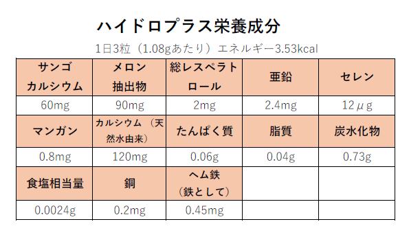 デンプン(国内製造)、カルシウム(天然水由来)、デンプン分解物、亜鉛酵母、食用精製加工油脂、銅酵母、マンガン酵母、ブドウ(新芽・若つる由来)エキス末、セレン酵母、小麦グリアジン、中鎖脂肪酸油、メロン濃縮物/ヒドロキシプロピルメチルセルロース、サンゴカルシウム、ヘム鉄、微粒二酸化ケイ素、ステアリン酸カルシウム、ゼイン